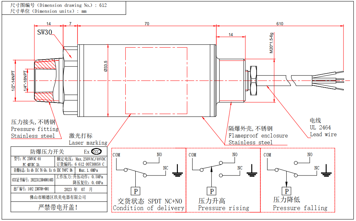 使用国际先进的不锈钢压力传感器制造,整体不锈钢结构,防水、防尘、防爆性能良好,压力可调节,自动测控系统内的压力,防止系统内的压力过高或过低,输出开关信号,起超压报警和低压报警作用。确保设备、系统、人员在安全的压力范围内工作。